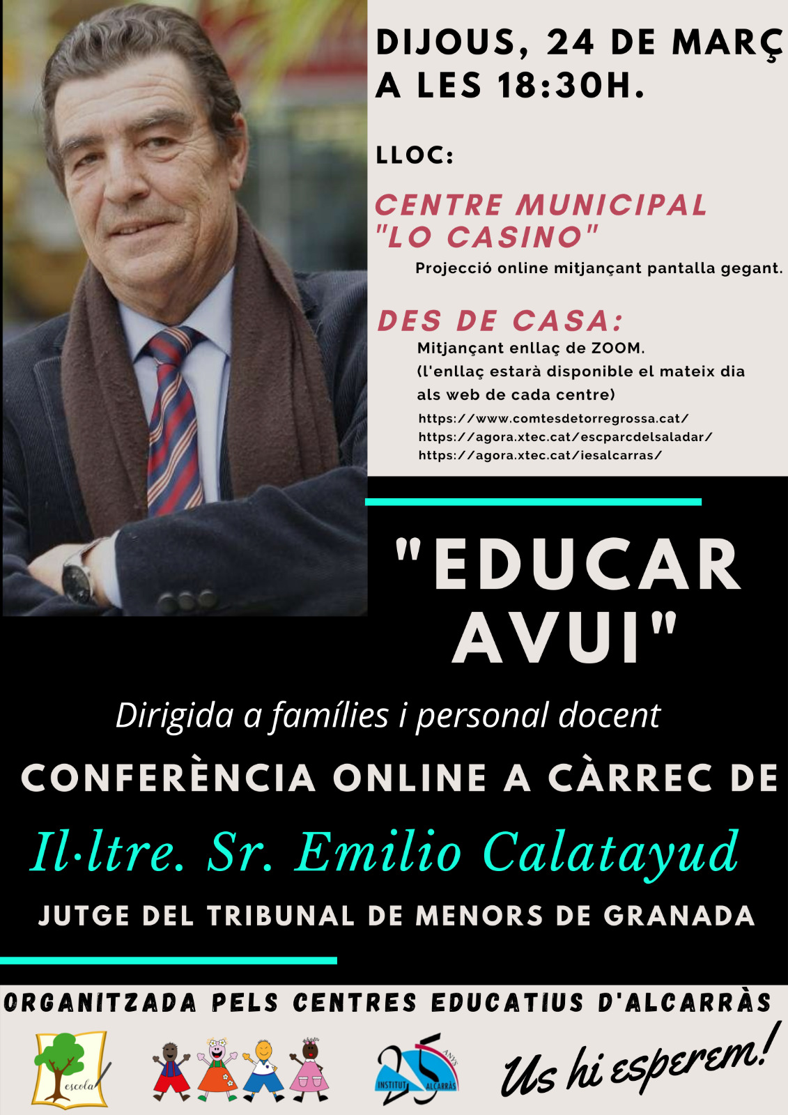 Conferència online "EDUCAR AVUI" a càrrec de l'Il·lustre. Sr. EMILIO CALATAYUD, Jutge del Tribunal de Menors de Granada, dirigida a famílies i personal docent.