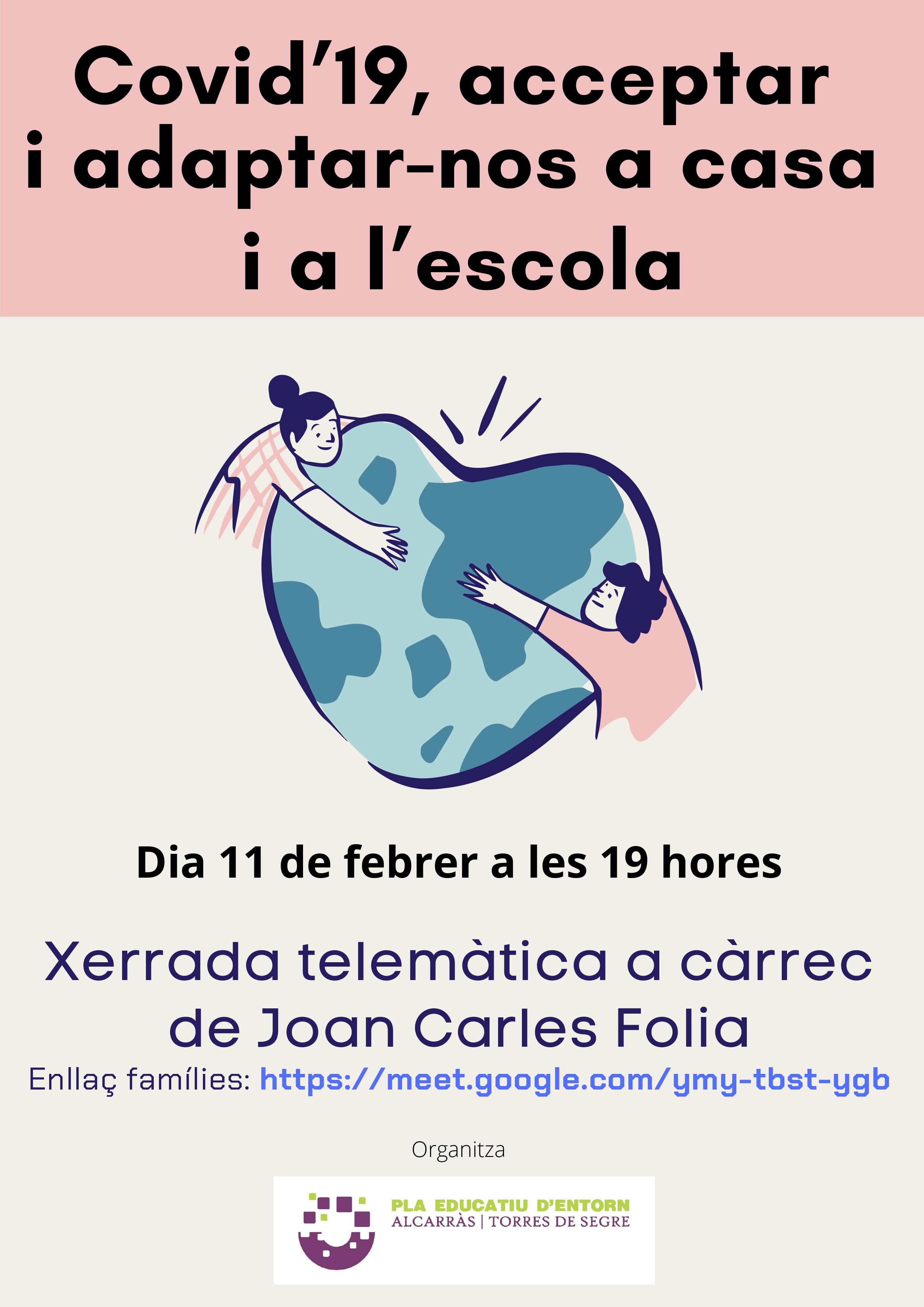 El proper dijous dia 11 de febrer a les 19h tindrà lloc la xerrada virtual “Covid19, acceptar i adaptar-nos a casa i al’escola” a càrrec de Joan Carles Folia, organitzada pel Pla Educatiu d’Entorn d’Alcarràs i Torres de Segre. La xerrada es oberta i va dirigida als pares amb infants en edat escolar.