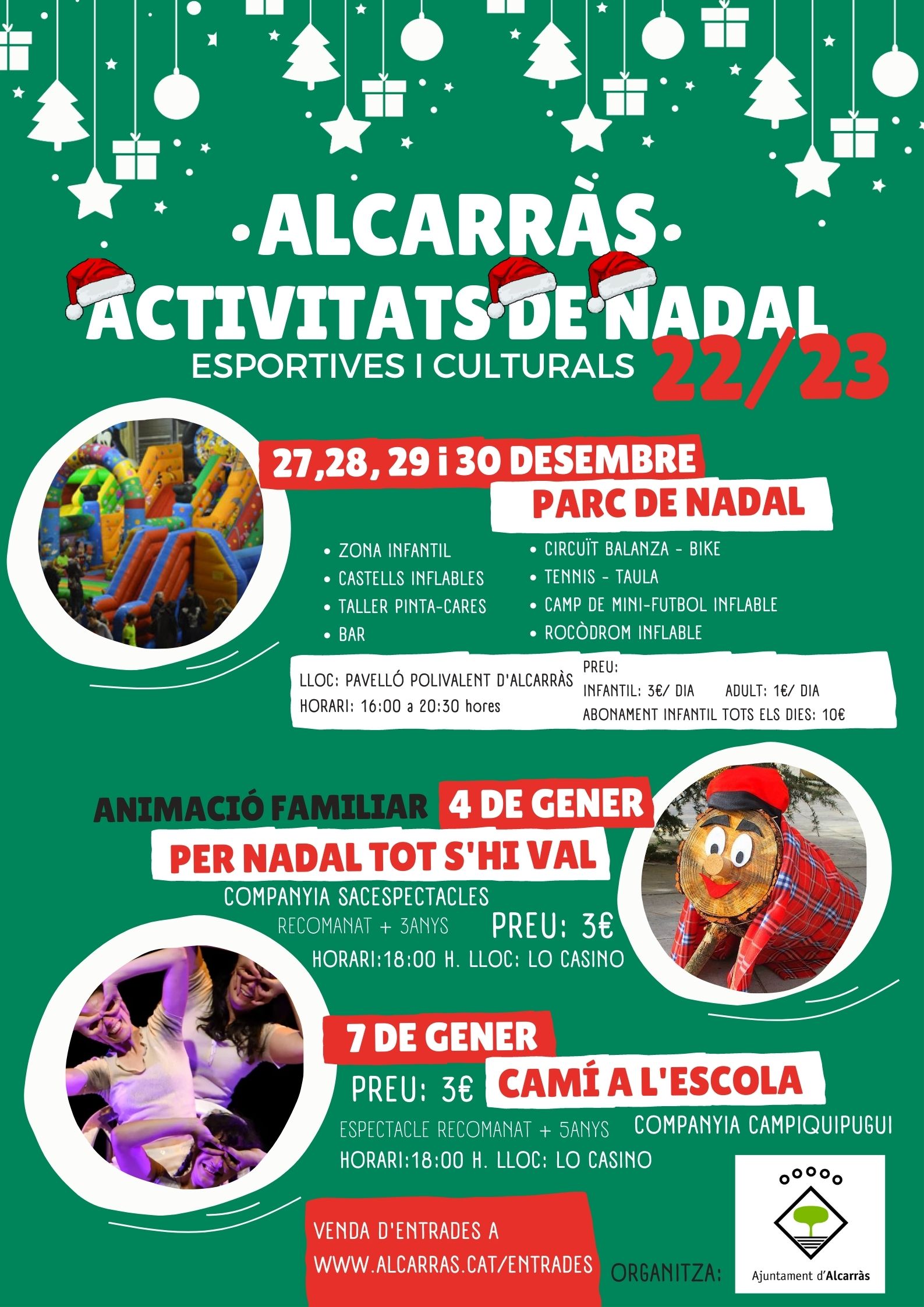 Dins la programació de les activitats nadalenques, l’Ajuntament també ha programat dues obres de teatre al Centre Cultural Municipal Lo Casino. La primera serà ‘Per Nadal tot s’hi val’, tindrà lloc el dia 4 de gener de 2023 a les 18 hores i anirà a càrrec de la companyia Sacespectacles. I la segona es farà el dia 7 de gener també a les 18 hores, es titula ‘Camí a l’escola’, del grup escènic Campiquipugui i és un espectacle recomanat per a infants de més de 5 anys.