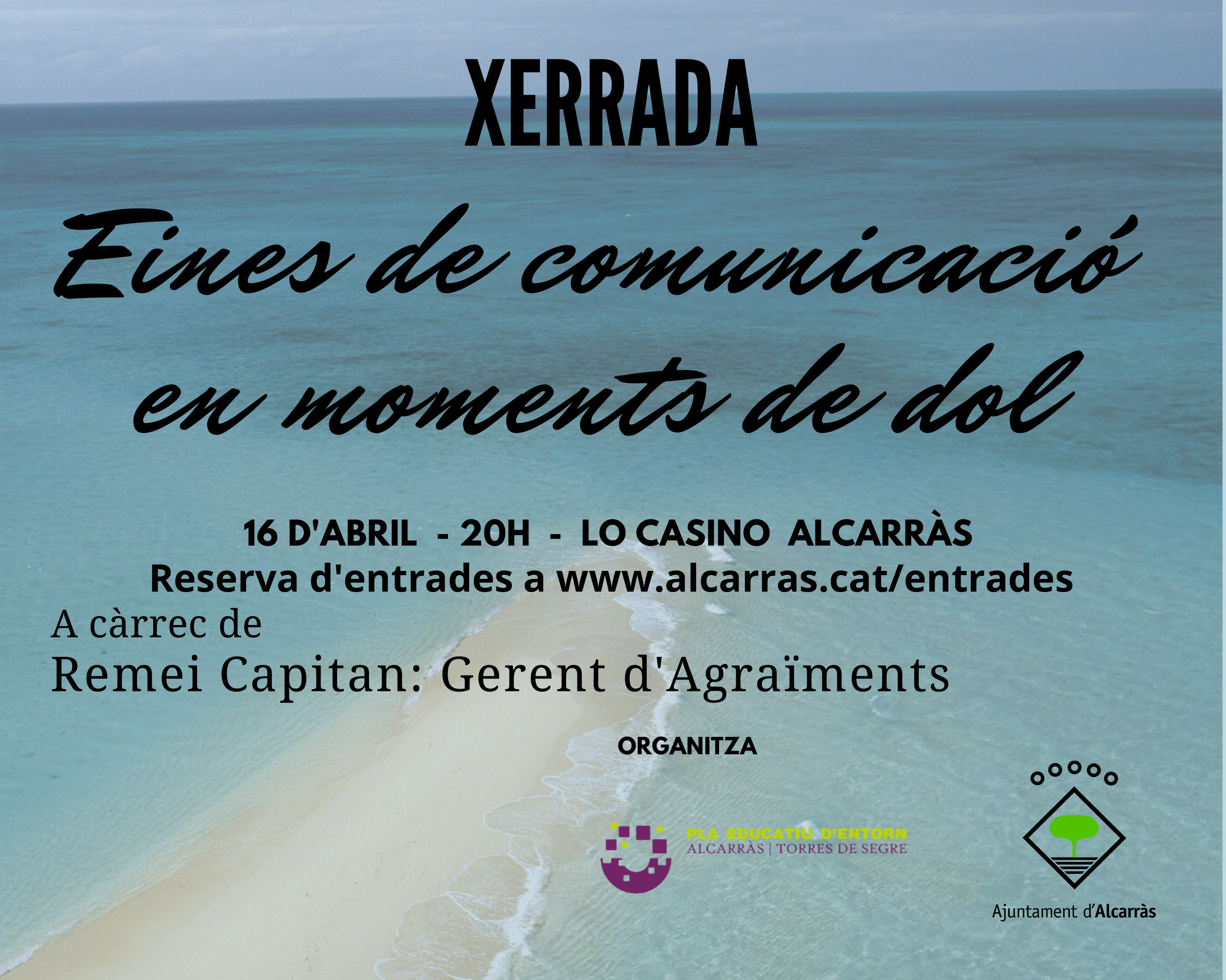 El Pla Educatiu d’Entorn d’Alcarràs i Torres de Segre organitza, aquest proper divendres dia 16 d’abril a les 20h a Lo Casino, la xerrada presencial “Eines de comunicació en moments de dol”, a càrrec de Remei Capitán gerent de l’empresa AGRAÏMENTS.