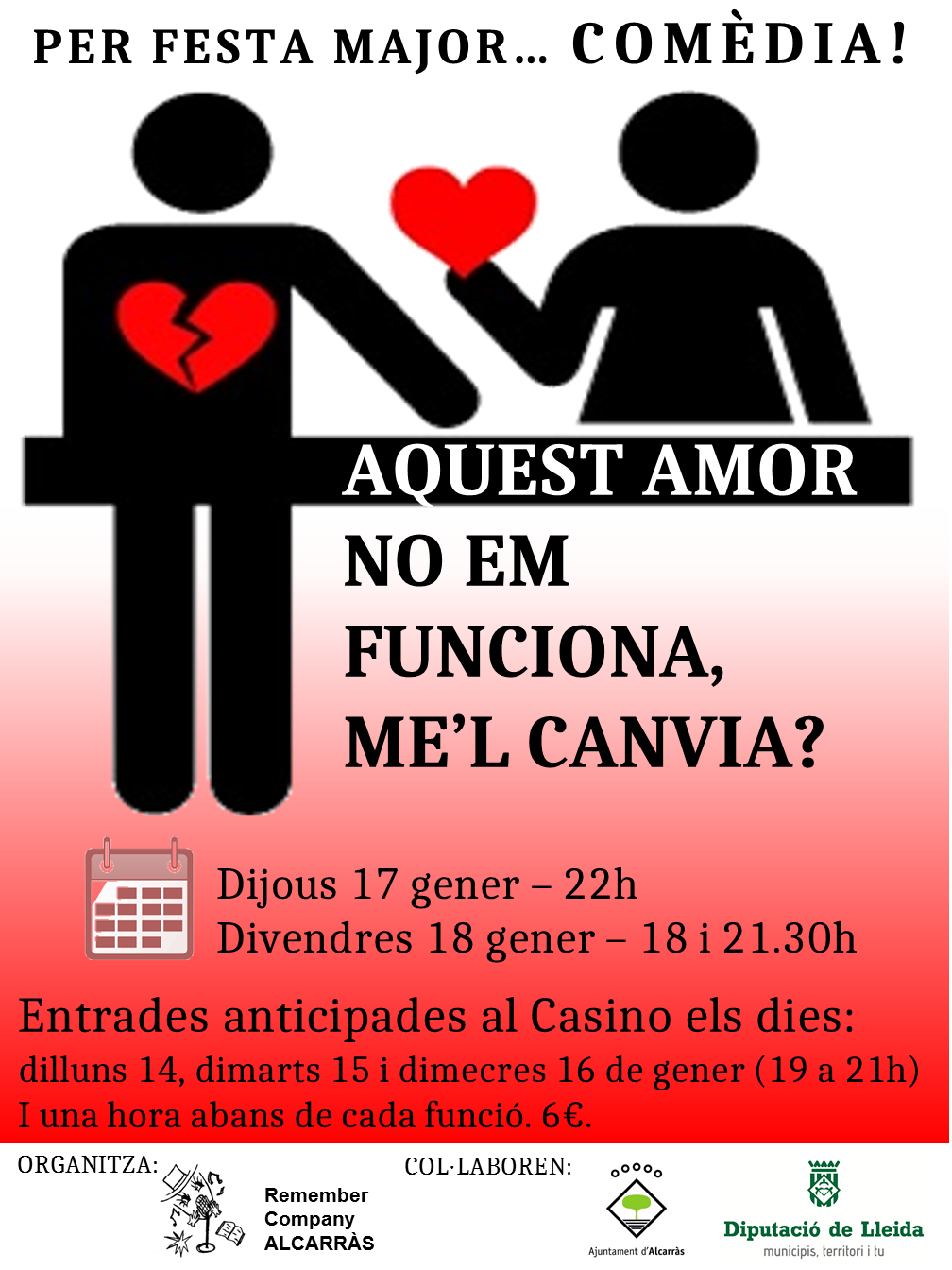 Preu de l’entrada: 6 euros. Venda d’entrades anticipades el 14, 15 i 16 de gener de 19 a 21h al CCM Lo Casino i, a taquilla una hora abans de la representació.