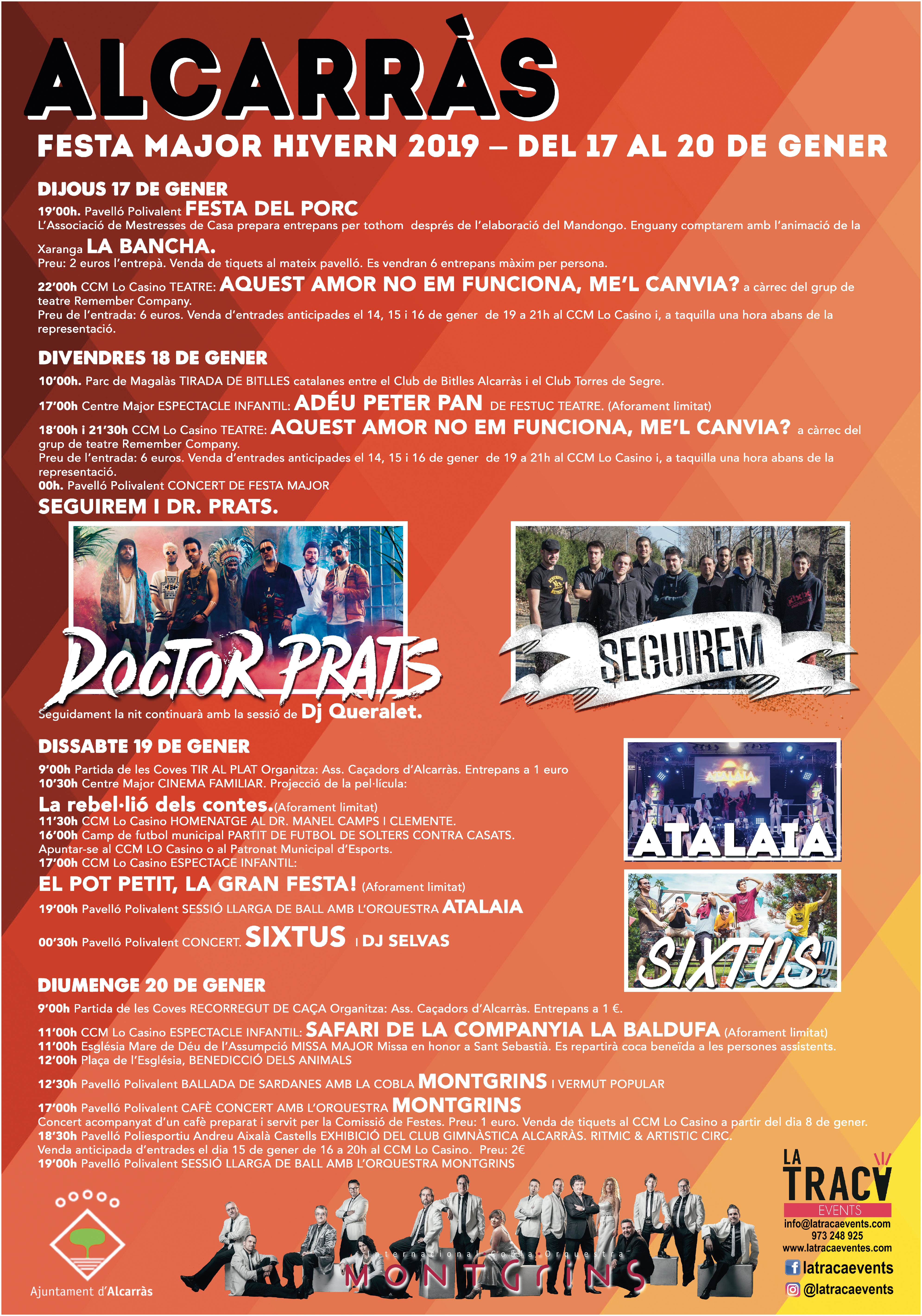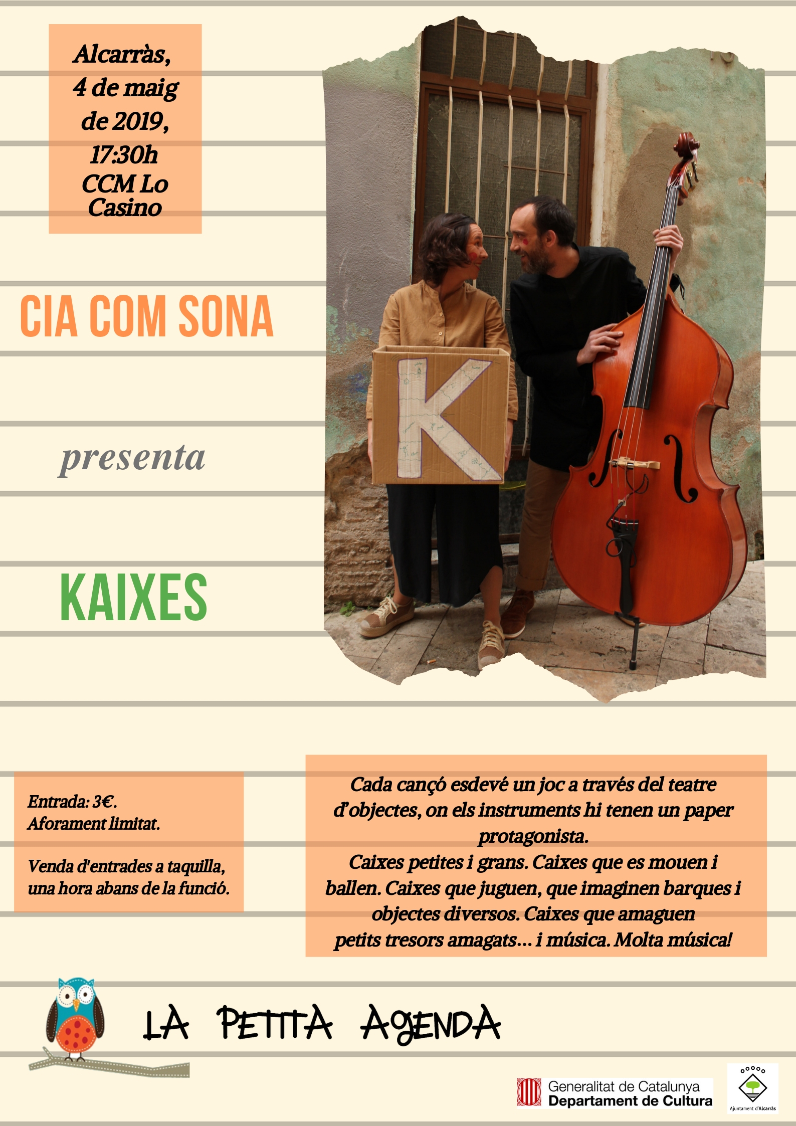 Preu de l’entrada: 6 euros. Venda d’entrades anticipades el 14, 15 i 16 de gener de 19 a 21h al CCM Lo Casino i, a taquilla una hora abans de la representació.