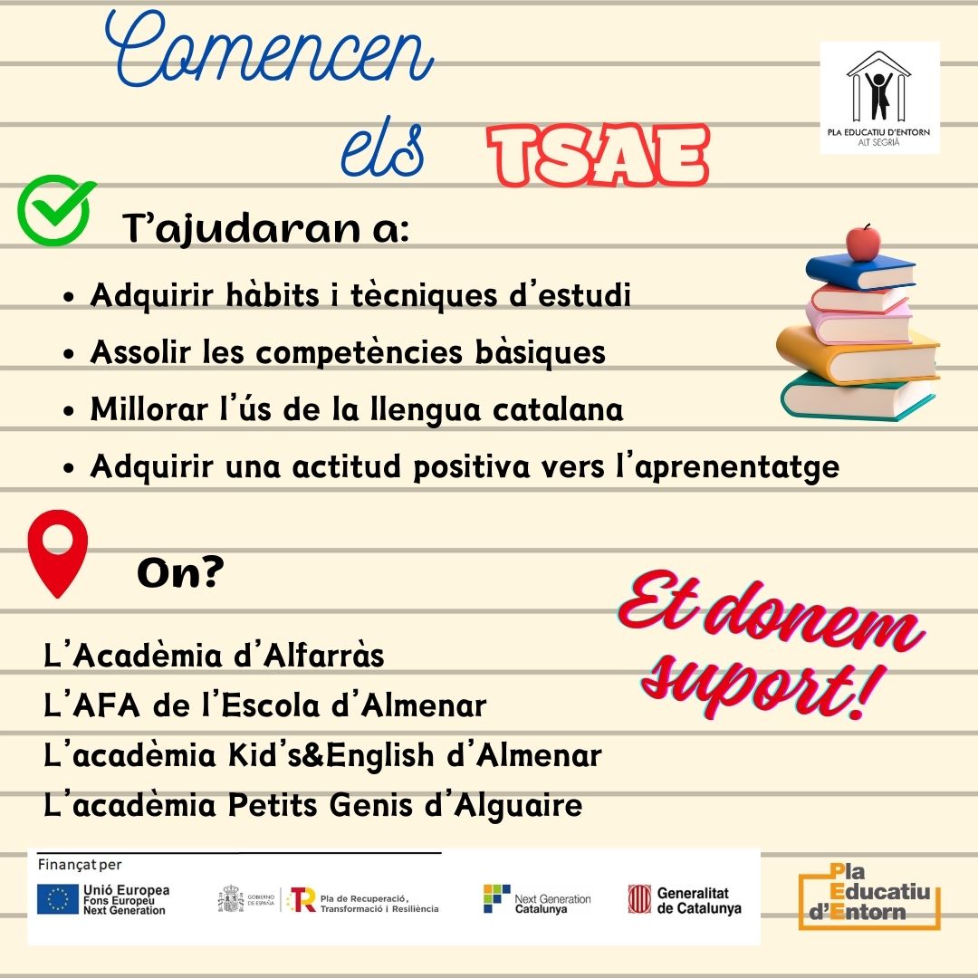 Iniciem els Tallers de Suport i Acompanyament Educatiu a l'Alt Segrià. Des d'avui i fins al mes de juny donem suport a alumnes de primària i secundària per a que assoleixin els aprenentatges de l'etapa que estan cursant. Activitat finançada per Fons Europeus