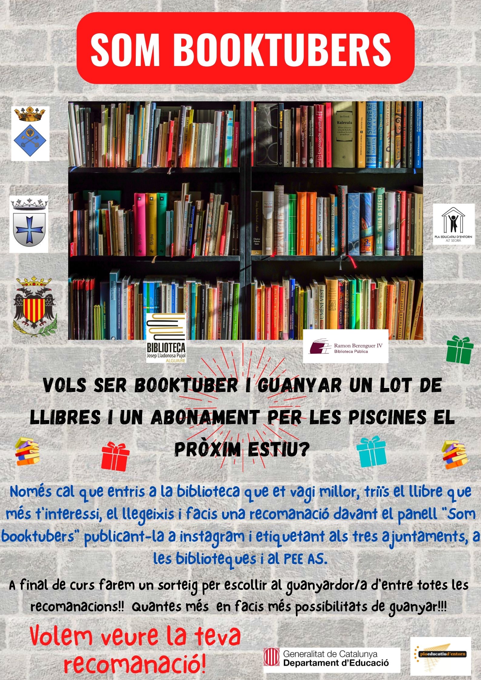 El PEE de l'Alt Segrià i les tres biblioteques volem animar a tots els alumnes de l'Institut d'Almenar a que es converteixin en Booktubers i entrin al sorteig d'un lot de llibres i d'un abonament per les piscines del seu municipi.