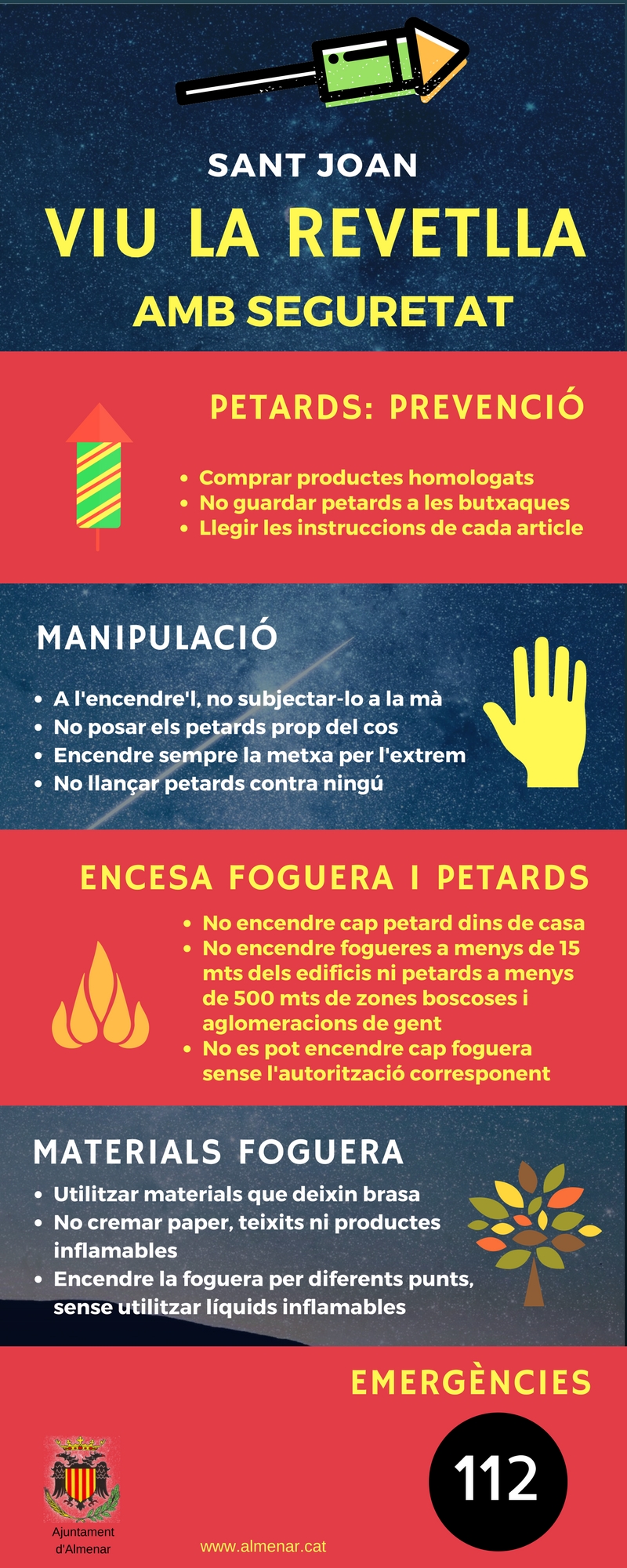 Us informem de l'Alerta INFOCAT per elevat ris d'incendi forestal a causa de les temperatures extremes amb un alt perill d'ignició per la pirotècnia de la revetlla de Sant Joan. Us recordem també de tenir precaució amb els petards i les fogueres. No es poden fer fogueres si no es té el permís corresponent. Per a qualsevol emergència, truqueu al 112.
