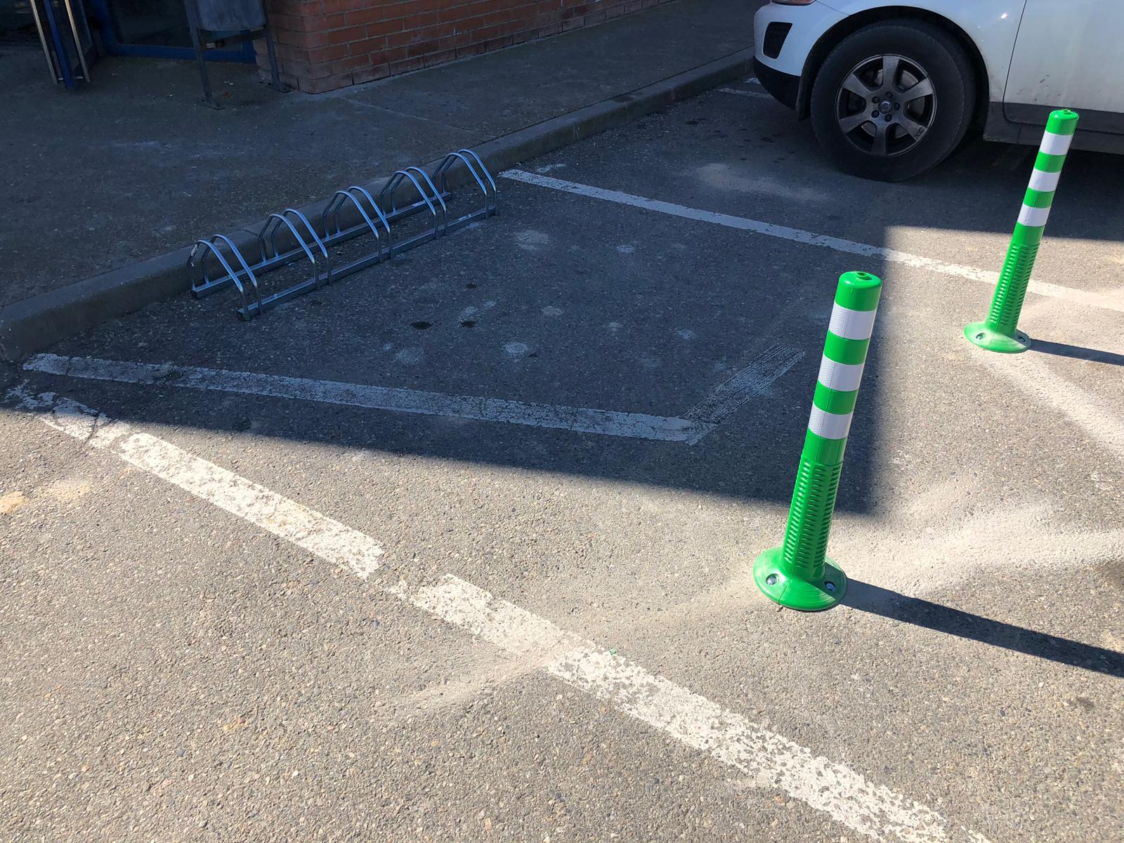 Davant del Pavelló Poliesportiu s'ha instal·lat un aparcament per a bicicletes, delimitat per dos pilones que impedeixen que la plaça d'aparcament pugui ser ocupada per qualsevol altre vehicle.
