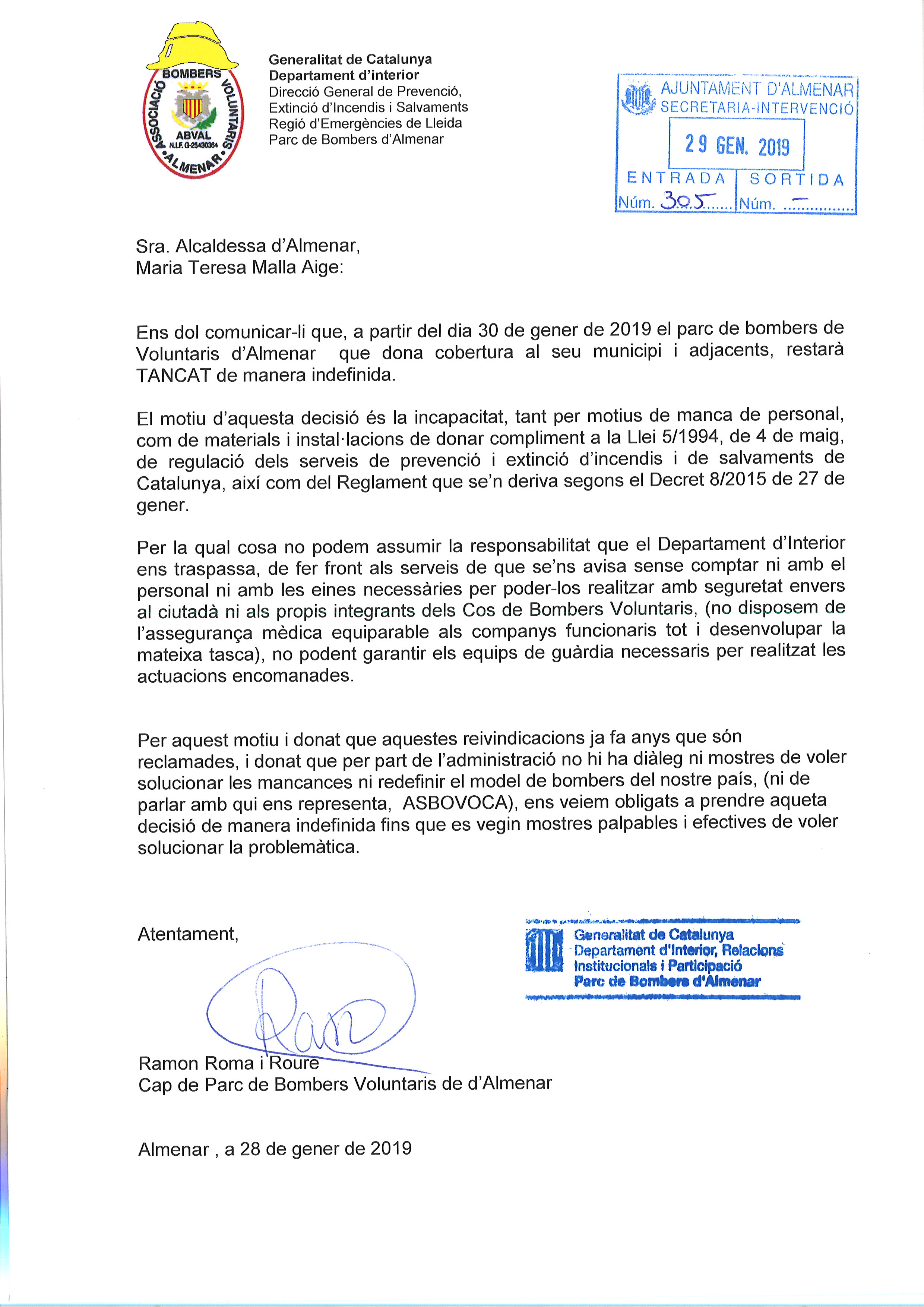 Ahir dimarts 29 de gener, l’Ajuntament es va reunir amb els Bombers Voluntaris d’Almenar qui van comunicar que, a partir d’avui dimecres 30 de gener, el Parc de Bombers d’Almenar restarà tancat indefinidament per adhesió a la vaga convocada per ASBOVOCA (Associació de Bombers Voluntaris de Catalunya).