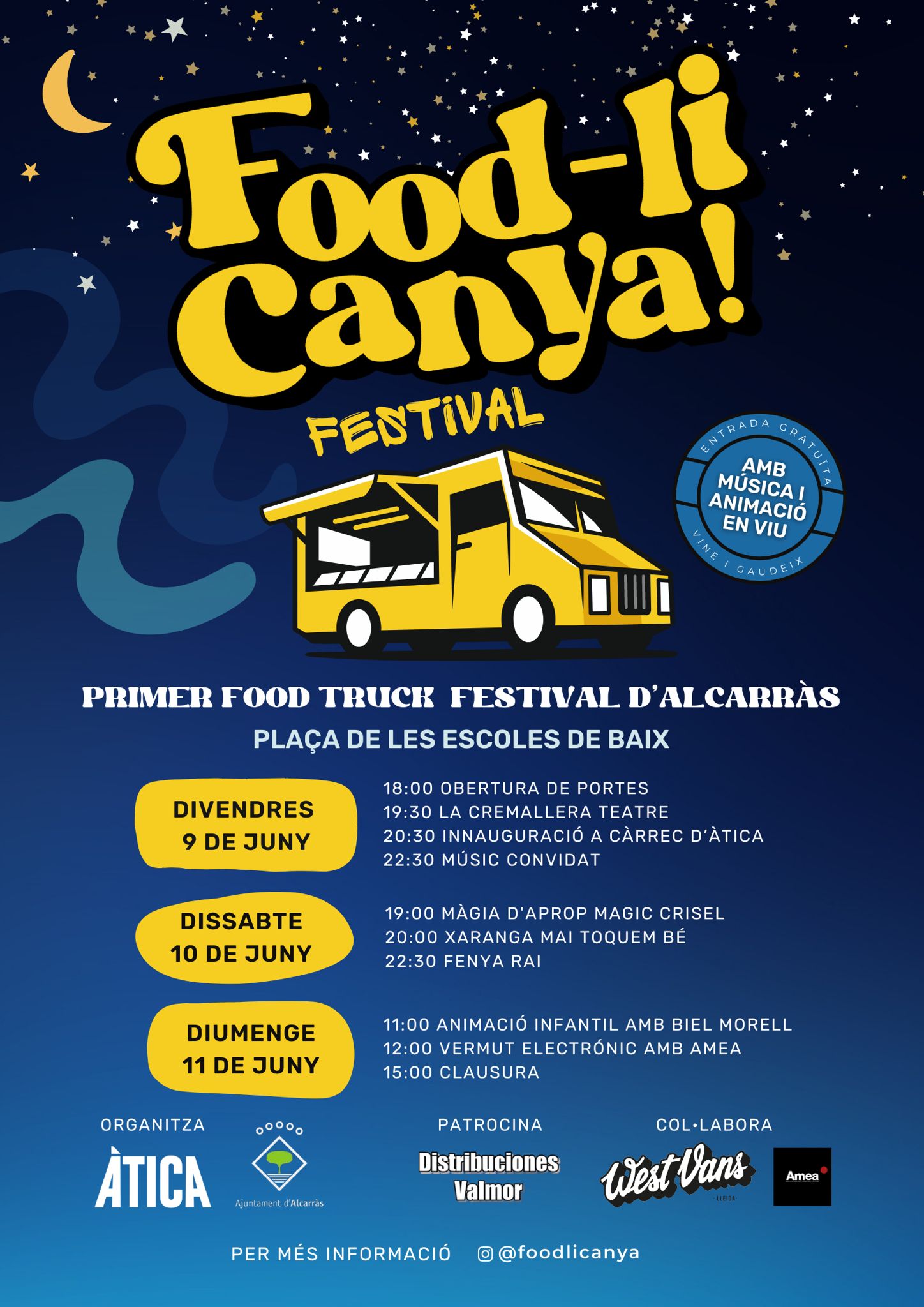 La festa comptarà amb una selecció de sis food trucks amb tota mena de productes per satisfer els paladars més exigents amb opcions com ara pizzes, croquetes, hot-dogs exòtics i hamburgueses, entre altres, amb aliments frescos i de qualitat. Així mateix, durant la nit, el festival es transforma en una festa amb música en directe i espectacles per gaudir de la nit. Entre els artistes convidats, destaquen les agrupacions Fenya Rai i La Cremallera Espectacles, així com la Txaranga Mai Toquem Bé.