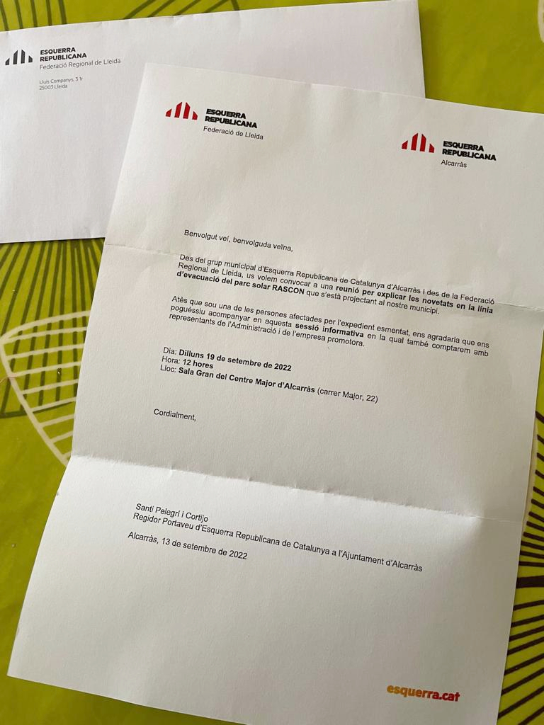 L'Ajuntament també ha sabut que ERC ha convocat les persones afectades pel soterrament a través d'una carta postal a una reunió que s'ha de celebrar el pròxim dilluns dia 19 a Alcarràs "per explicar les novetats en la línia d'evacuació del parc solar RASCON". "Atès que sou una de les persones afectades per l'expedient esmentat, ens agradaria que ens poguéssiu acompanyar en aquesta sessió informativa en la qual també comptarem amb representants de l'Administració i de l'empresa promotora", segueix la missiva.