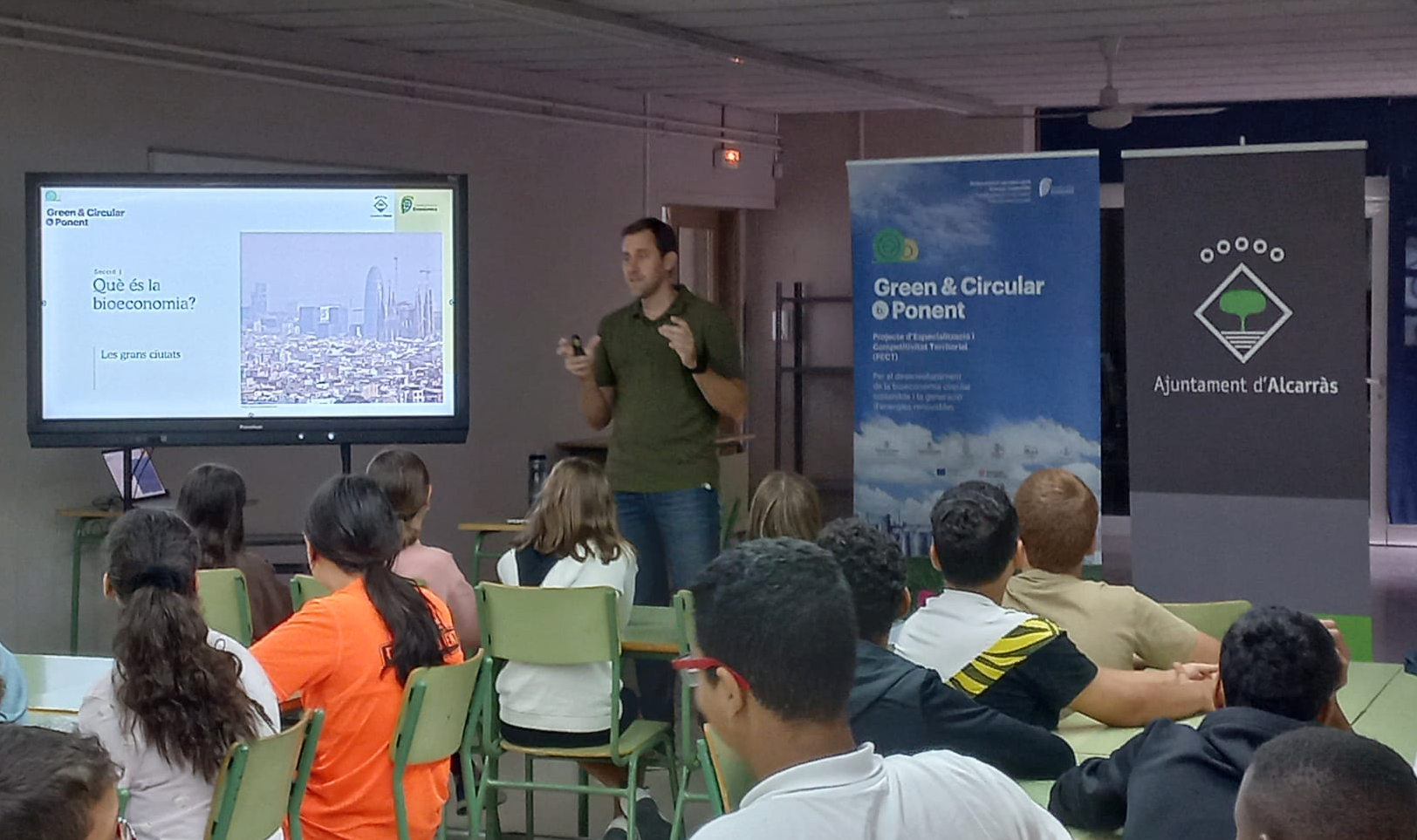 Uns 70 alumnes de primer curs de l’ESO de l’Institut d'Alcarràs han participat aquest divendres en un ‘Taller de Bioeconomia’ organitzat per l’Ajuntament d’#Alcarràs i finançat pel Projecte d’Especialització i Competitivitat Territorial (PECT) Green & Circular. El taller, de conscienciació sobre l’economia sostenible i circular, ha estat impartit per Joan Lordan de l’empresa Akis Internacional.