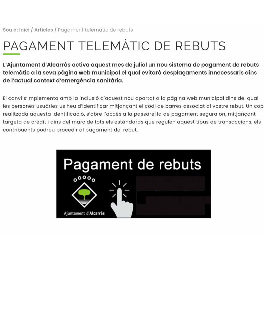 Alcarràs activa un nou sistema de pagament de rebuts no domiciliats a la seva pàgina web municipal