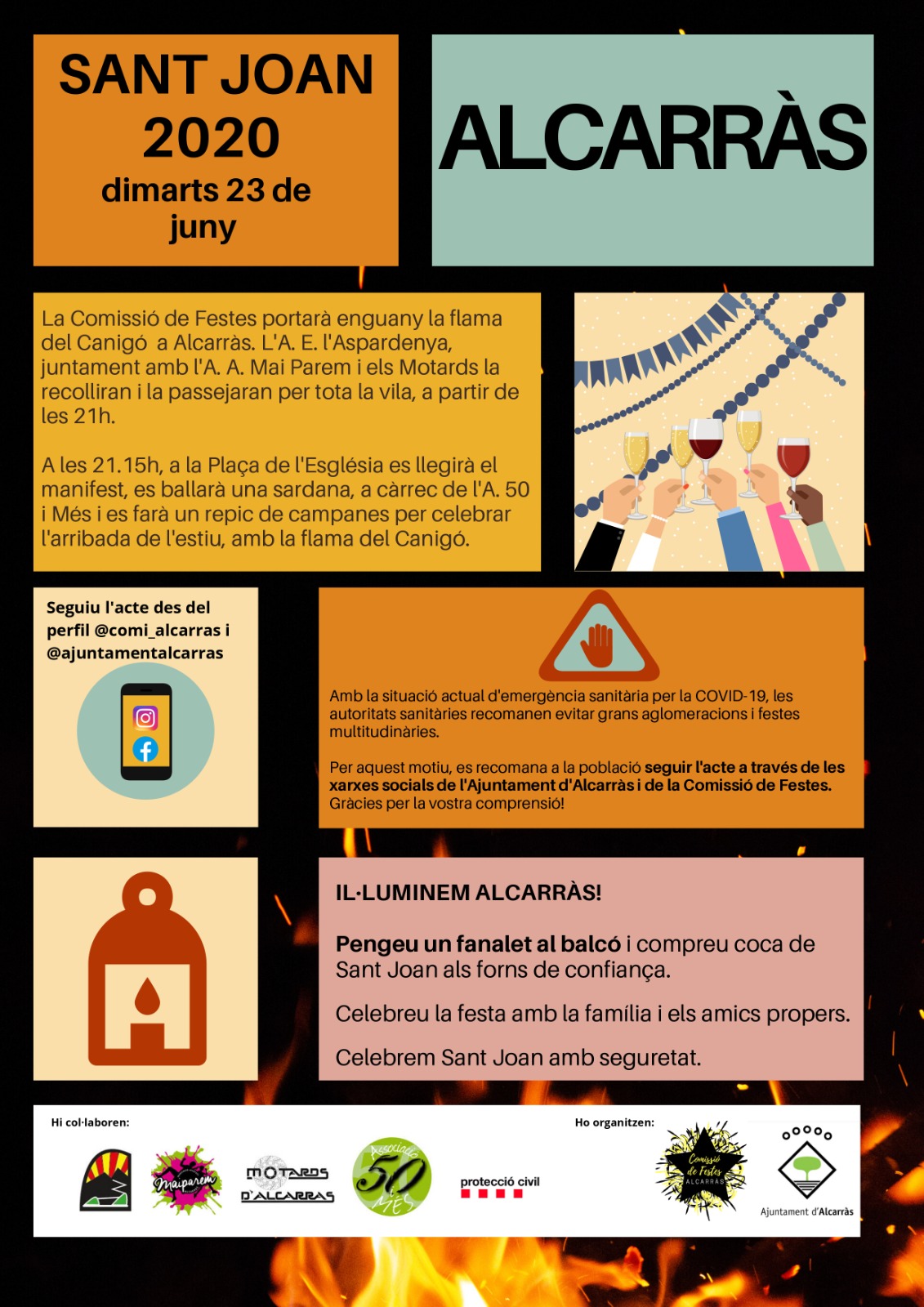 La Flama arribarà aquest proper 23 de juny al capvespre i desfilarà a partir de les 21.00 h per tota la vila de la mà de la Comissió de Festes, l’AE l’Espardenya, l’Associació Atlètica Mai Parem i els Motards d’Alcarràs. Després, en concret a les 21.15 h i a la plaça de l’Esglèsia, es donarà lectura al manifest, l’associació 50 i Més ballarà una sardana i un repic de campanes donarà la benvinguda a l’estiu. A banda, i des del consistori i la Comissió de Festes es proposa als veïns que pengin un fanalet al balcó per il·luminar l’inici de l’estiu i s’aconsella que la revetlla se celebri “amb la família i els amics propers” tot evitant aglomeracions a la via pública i festes multitudinàries: