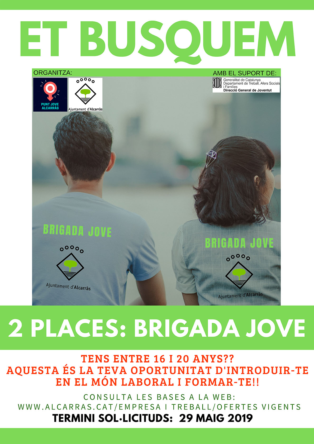 L’Ajuntament d’Alcarràs ha obert aquest dimecres el procés de selecció de dues places dirigides al jovent d’entre 16 i 20 anys del municipi per a donar suport a la Brigada Municipal durant el període estival. La iniciativa s’emmarca dins la tercera edició del Projecte Brigada Jove 2019 que pretén oferir formació als nois i noies introduint-los al món laboral mitjançant un contracte de treball temporal amb la finalitat de crear ocupació entre la població jove.