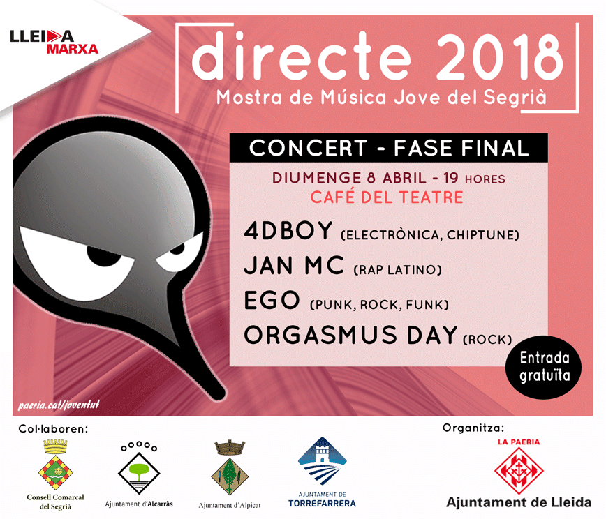 La fase final d’enguany ja té data de concert. Serà el proper 8 d’abril, a partir de les 19.00 hores, al Cafè del Teatre de Lleida. En aquesta última fase hi actuaran 4DBOY (electrònica , chiptune); JAN MC (rap latino), EGO (punk, rock i funk) i Orgasmus Day (rock). L’entrada a l’actuació és gratuïta.