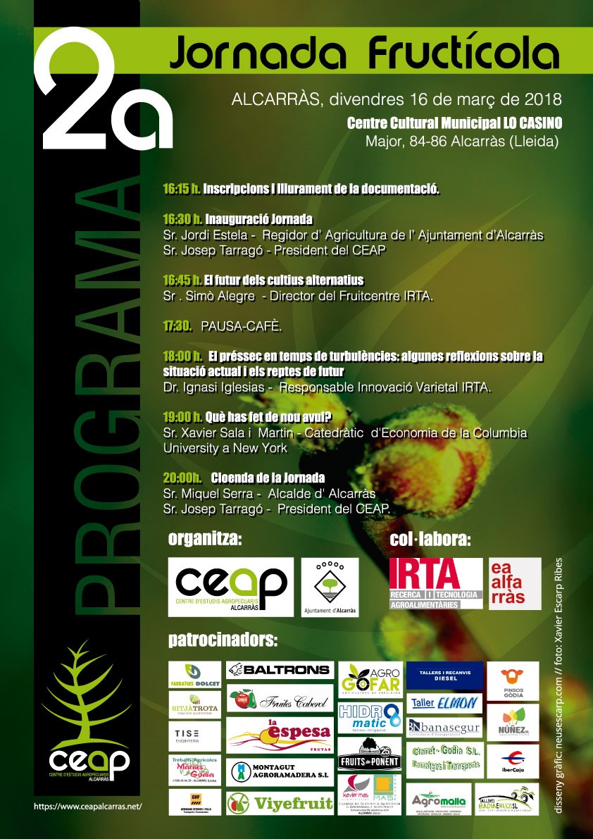 Alcarràs ha acollit avui la segona edició de la Jornada Fructícola de la vila, un certamen que ha tingut lloc en un ple de gent Centre Cultural Lo Casino, i que ha estat organitzat pel Centre d'Estudis Agropecuaris i que ha comptat amb la col·laboració del Ajuntament d'Alcarràs. Una jornada per parlar i debatre alternatives als cultius tradicionals, per fer front a les noves demandes dels mercats.