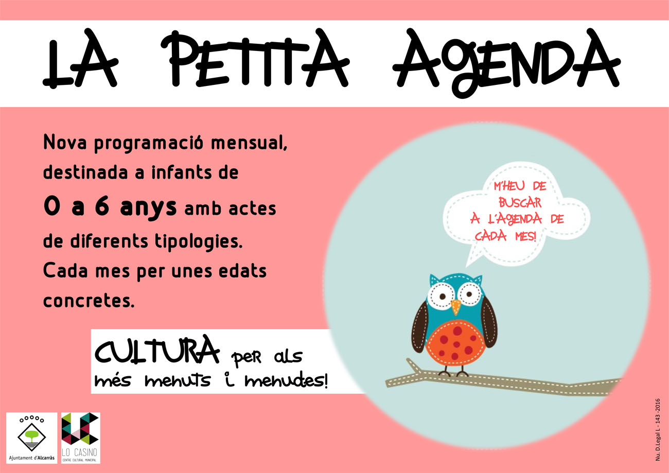 L'Ajuntament d'Alcarràs, a través de les regidories de Festes i Cultura, estrenen aquest proper mes de febrer 'La Petita Agenda'. L'objectiu d'aquesta iniciativa és programar mensualment 1 espectacle i/o taller dirigit al col·lectiu d'infants de 0 a 6 anys. "Volem apropar a aquest col·lectiu i les seves famílies diferents disciplines artístiques: música, circ, titelles, teatre i d'altres arts i modalitats per aquestes edats", assenyala Laia Sisó, regidoria de Cultura i Festes.