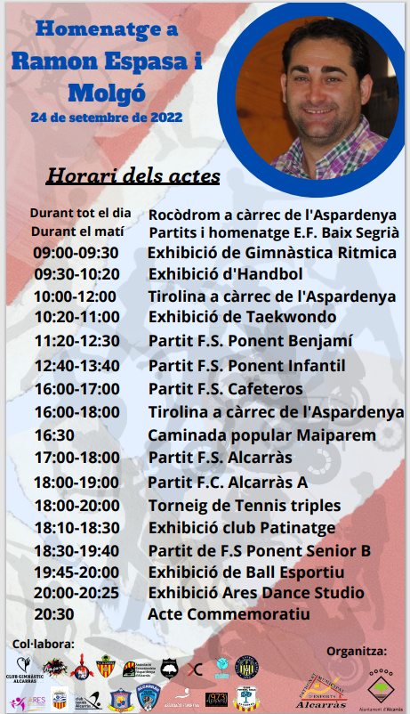 A les 20:30 hores, el poliesportiu acollirà l’acte d’homenatge a Ramon Espasa on està prevista la presència de la seva família, els regidors de la Corporació i els clubs i entitats esportives que han participat en la jornada. Segons explica la regidora d’Esports, Ester Ibars, “un grup de nens i nenes de l’esport base d’Alcarràs seran els encarregats d’entrar a la pista, juntament amb tres representants de cada club, la samarreta que hem fet pel Ramon, la qual romandrà exposada al poliesportiu”. “Esperem que vinguin moltes persones a aquest homenatge per recordar la gran i bona feina que va fer en Ramon Espasa per l’esport i el bon record que com a persona ens ha deixat a totes i a tots”, conclou la regidora Ibars.