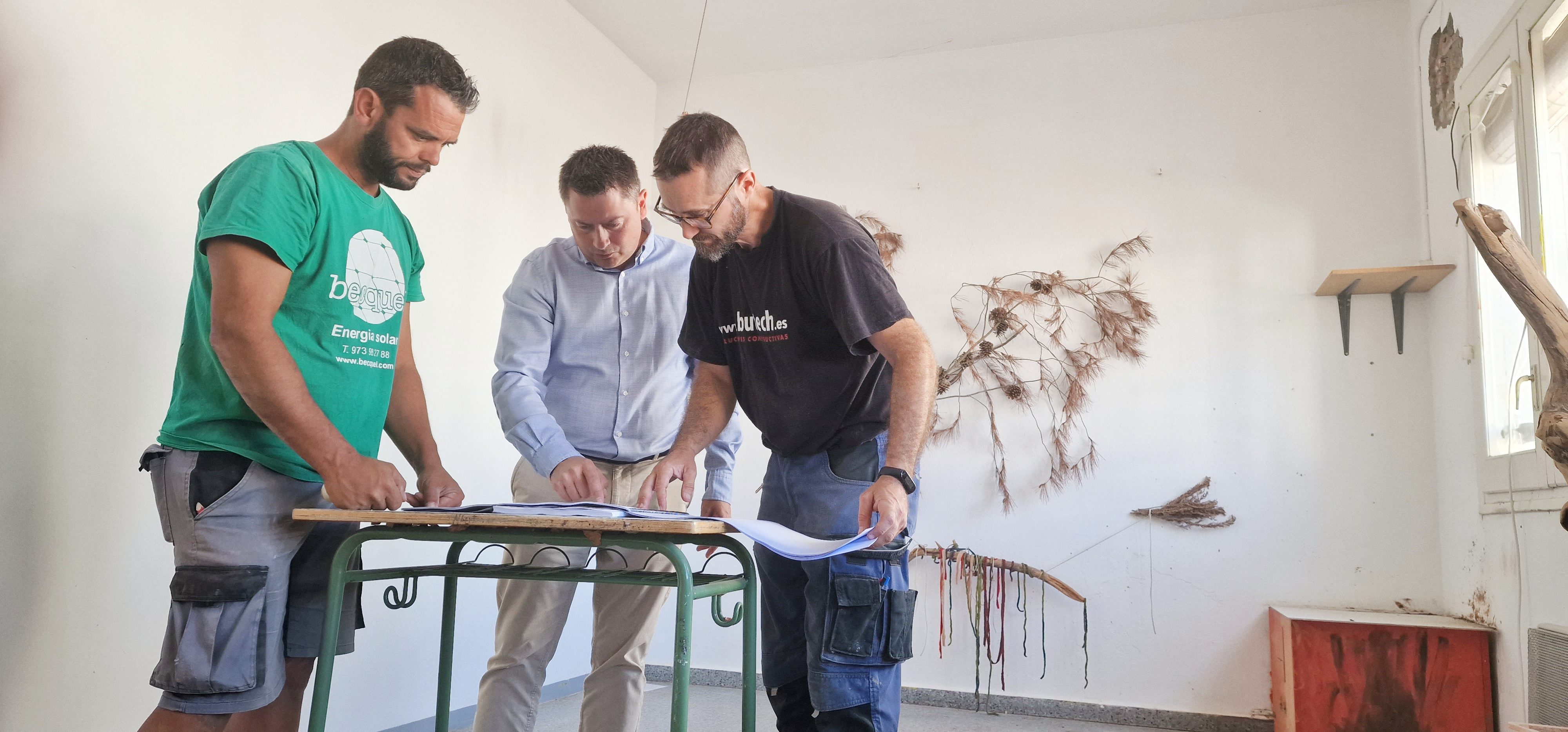L'alcalde, Jordi Janés, amb els operaris de l'empresa que aquest dimarts ha començat les obres de remodelació de les escoles velles, futur centre del BioHubLab.