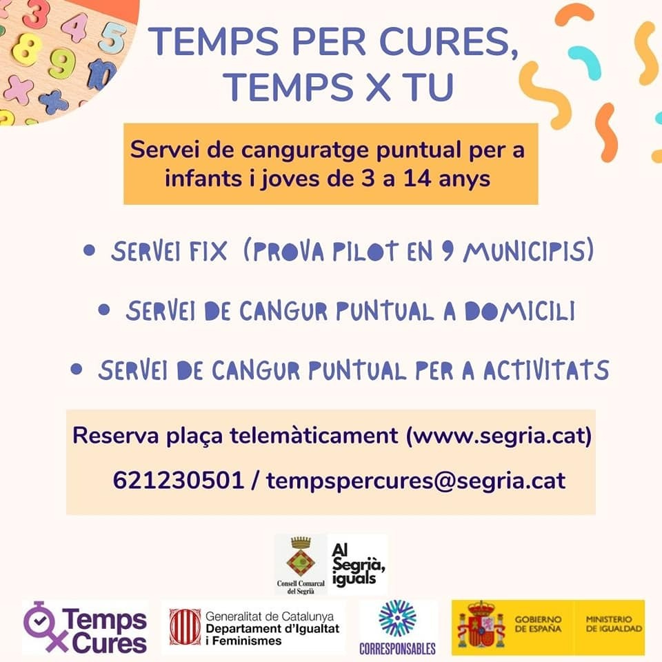 ℹ️👪 Aquest servei es diu ‘Temps per cures, temps per tu’ i és un nou programa de cura puntual gratuïta d’infants i joves de 3 a 14 anys a càrrec de professionals qualificats, que ha posat en marxa el Consell Comarcal del Segrià amb el suport del Departament d'Igualtat i Feminismes de la Generalitat i la col·laboració de l’Ajuntament d’Alcarràs.