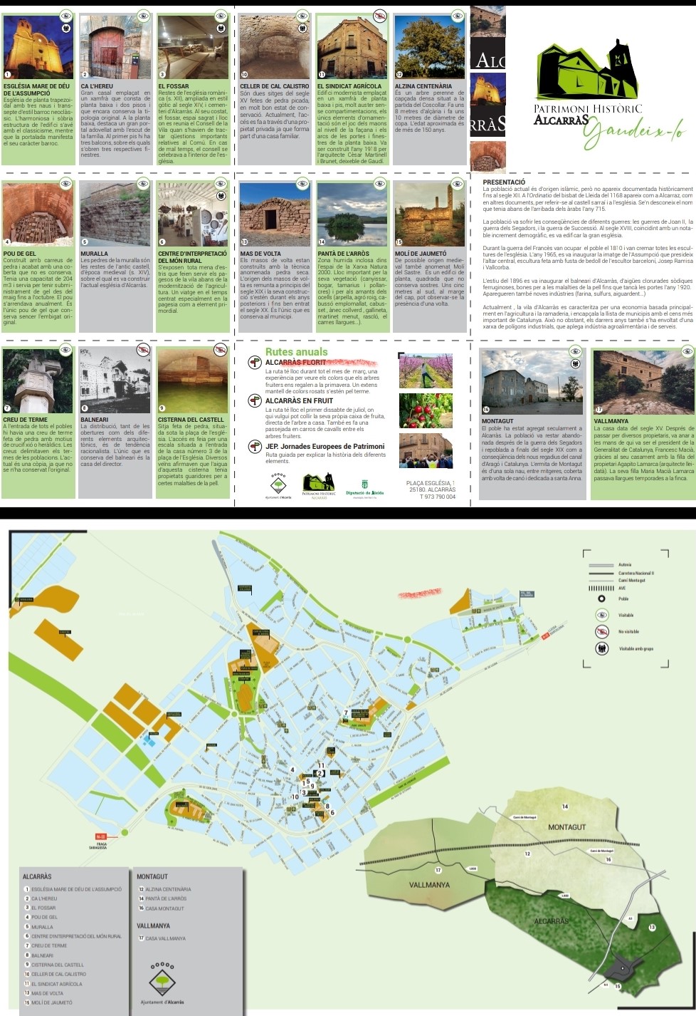 Al plànol, s’inclouen un total de dinou elements patrimonials i, d’ells, disset són elements físics com ara l’església de la Mare de Déu de l’Assumpció, Ca l’Hereu, el Fossar o el Pou de Gel. Altres elements com ara la Muralla, el Centre d’Interpretació del Món Rural (CIMRA), la Creu de terme, les restes de l’antic balneari o la Cisterna del castell figuren també al plànol juntament amb el Celler de Cal Calistro, l’edifici del Sindicat Agrícola, l’Alzina centenària, el Mas de Volta, el Pantà de l’Arrós, el Molí de Jaumetó o les cases senyorials de Vallmanya i Montagut. Finalment, el plànol que s’ha editat inclou dos elements (els camps florits de fruiters i els mateixos arbres carregats de fruita a l’estiu) que són, a més a més, protagonistes de dues de les rutes que s’ofereixen a les persones que visiten Alcarràs des de la regidoria de Patrimoni: l’Alcarràs Florit i l’Alcarràs en Fruit. La tercera ruta, dissenyada per conèixer el patrimoni físic del municipi, convida a realitzar una passejada pel poble i els termes de Vallmanya i Montagut per conèixer els diferents elements protagonistes del plànol. “El patrimoni d’Alcarràs és divers i singular i, si es coneix mitjançant una ruta guiada, permet conèixer qui som i d’on venim. Tots aquests elements patrimonials dels quals fem esment al nou plànol expliquen una part de les raons que fan que les alcarrassines i els alcarrassins de l’actualitat siguem com som i, per això, s’han de difondre perquè tothom els conegui i aquest coneixement es concreti en estimació i orgull de pertinença. Hi ha moltes raons per estar orgullós de ser alcarrassí o alcarrassina i, nosaltres, en aquest nou plànol-guia, hem inclòs, dinou”, explica Gerard Companys, regidor de Patrimoni Històric